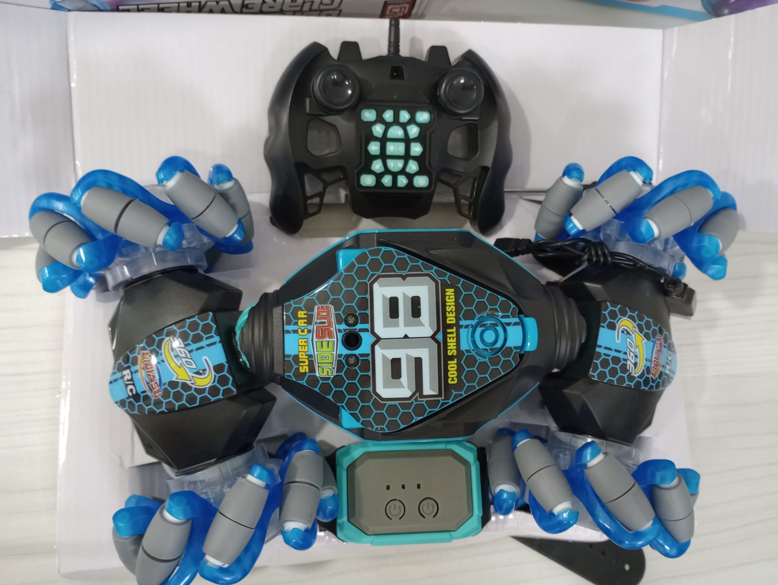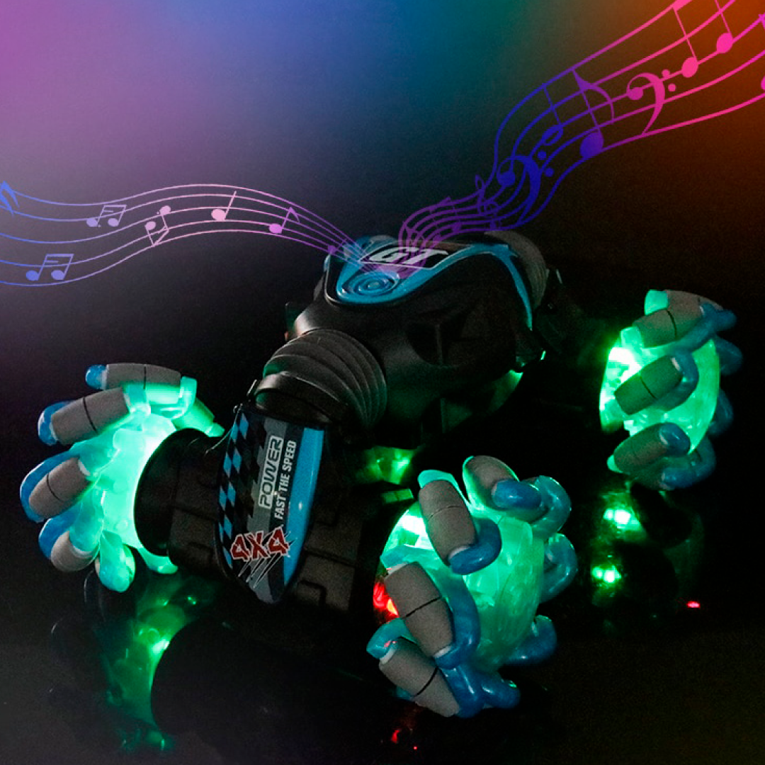 Deslumbrante juego de luces, emite música, luces led a los costados, movimiento de coche delante, hacia atrás, gira.