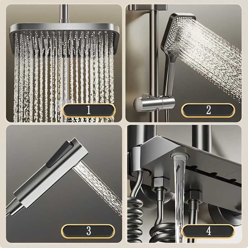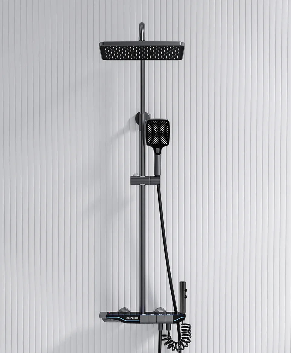 El Sistema de Ducha con Termostato es una experiencia de spa de lujo en tu hogar . Incluye un elegante cabezal de ducha vanguardista y un juego de baño inteligente digital, fácil de montar en tu pared de baño.