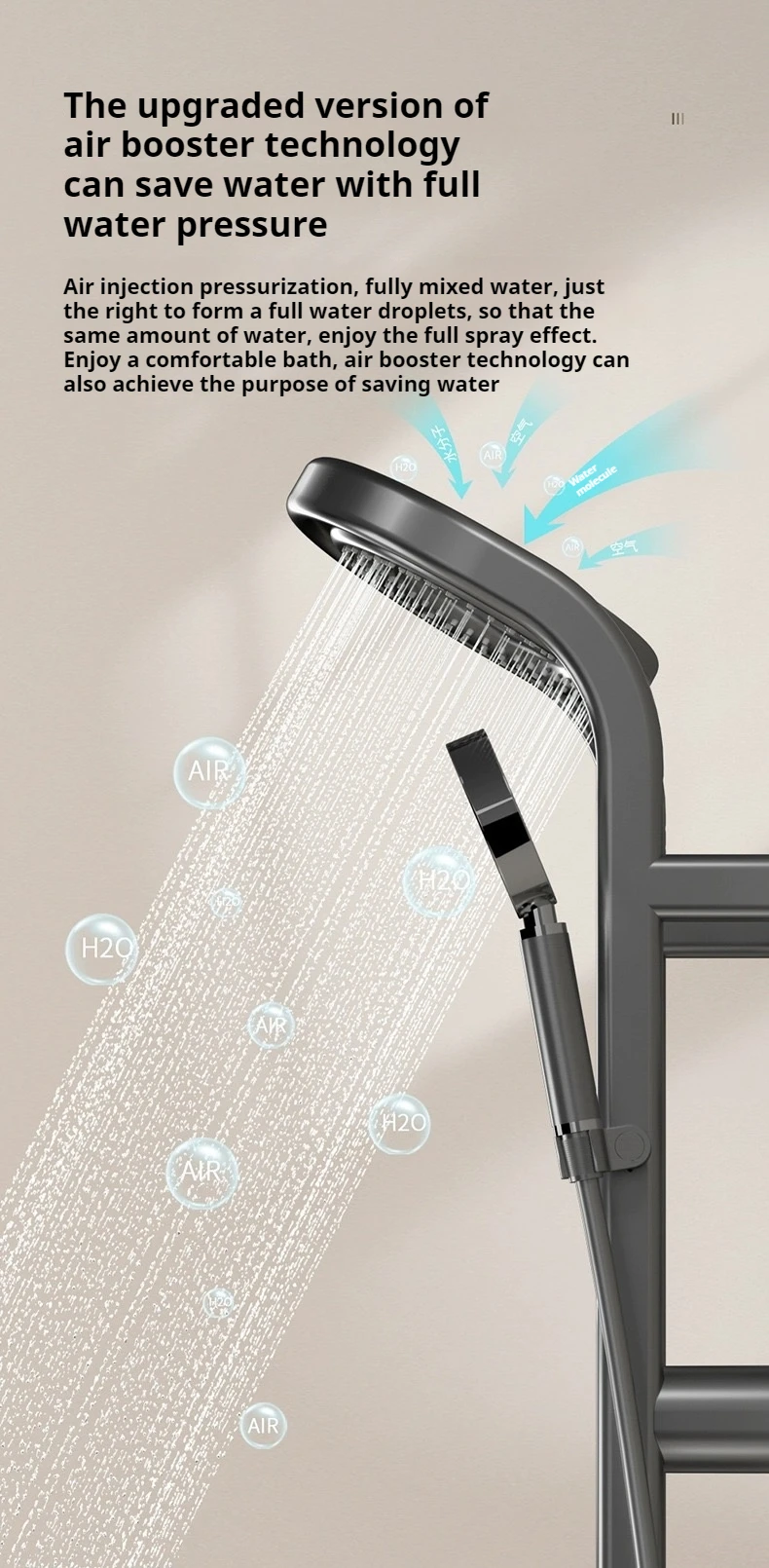 Convierte cada ducha en una experiencia de spa personalizada, optimizael consumo de agua sin perder potencia, ayudándote a ahorrar hasta un 30% en comparación con duchas tradicionales.