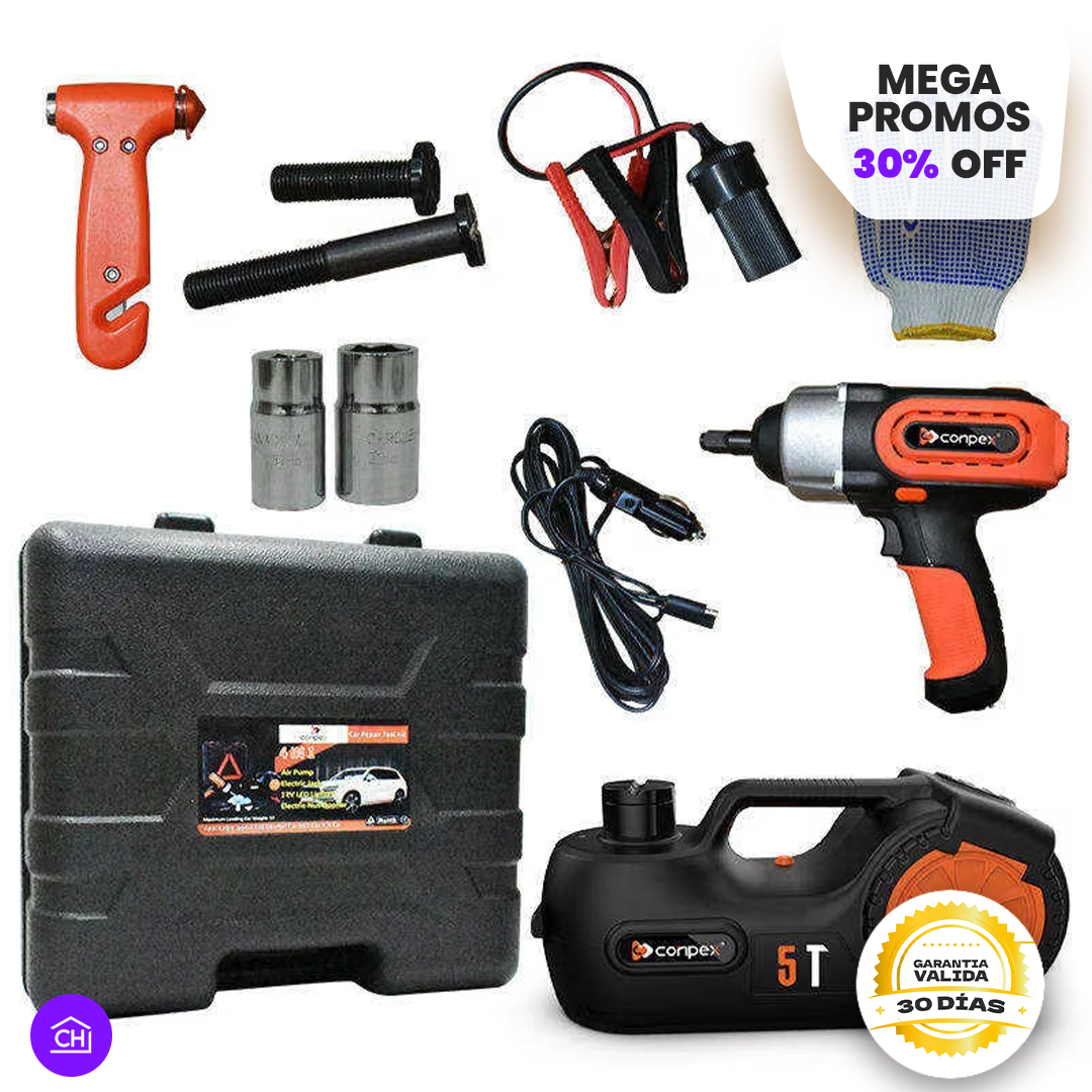 ¡Es hora de una actualización! El CONPEX Kit de gato eléctrico es tu aliado perfecto en la carretera y en el garaje. Este kit completo incluye una llave de impacto eléctrica, un martillo de seguridad, una caja de plástico resistente, un cable de alimentación de 11.5 ft, abrazaderas de batería con alambre, un par de guantes y un manual de usuario.