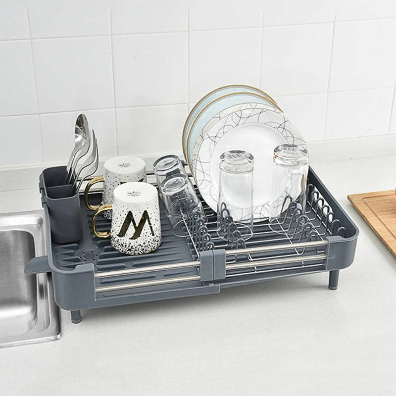 Transforma tu Cocina con Elegancia y Funcionalidad: Organizador de Platos Extensible con Drenaje y Soporte de Cubiertos