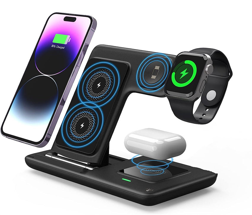 ⚡Compatibilidad universal: Las estaciones de carga inalámbricas 3 en 1 son compatibles con una amplia gama de dispositivos, incluidos teléfonos inteligentes, relojes inteligentes y audífonos inalámbricos, lo que significa que puedes cargar cualquier dispositivo compatible con carga inalámbrica.⚡