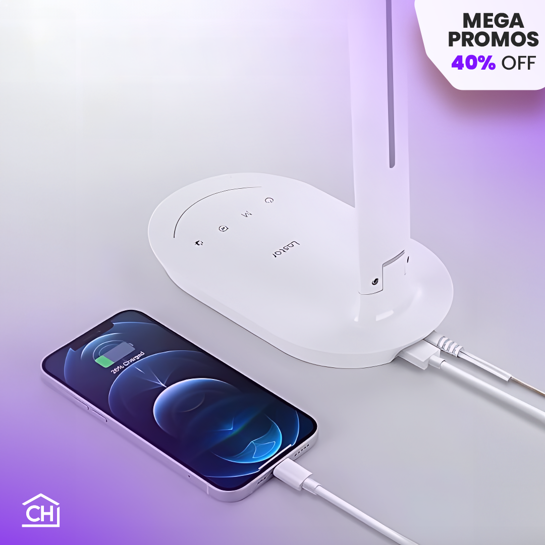 La LuminaDesk Pro transforma cualquier rincón en un área de trabajo bien iluminada y cómoda. Con cuatro modos de color ajustables y puertos de carga USB A+C, nunca más te faltará luz ni energía para tus dispositivos.