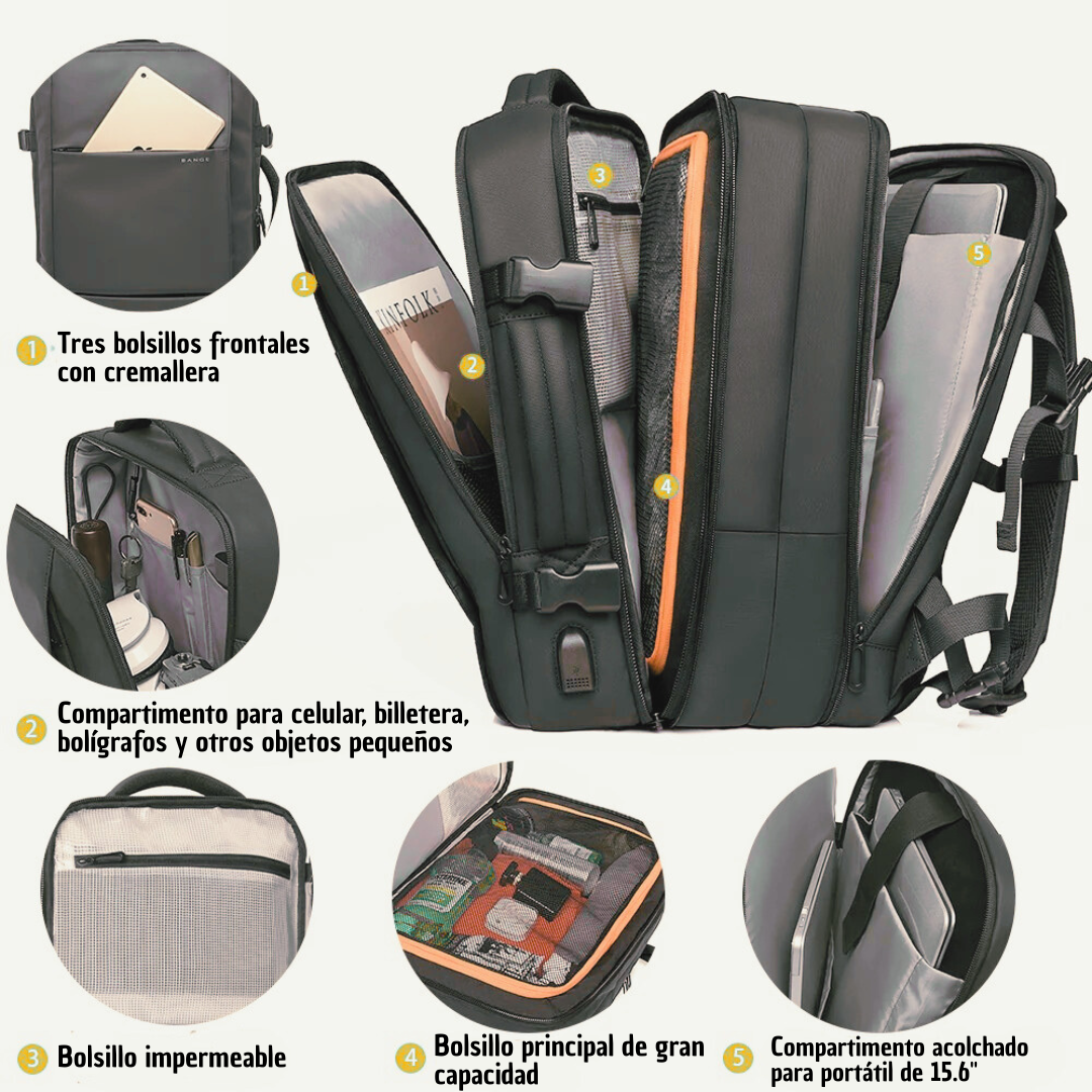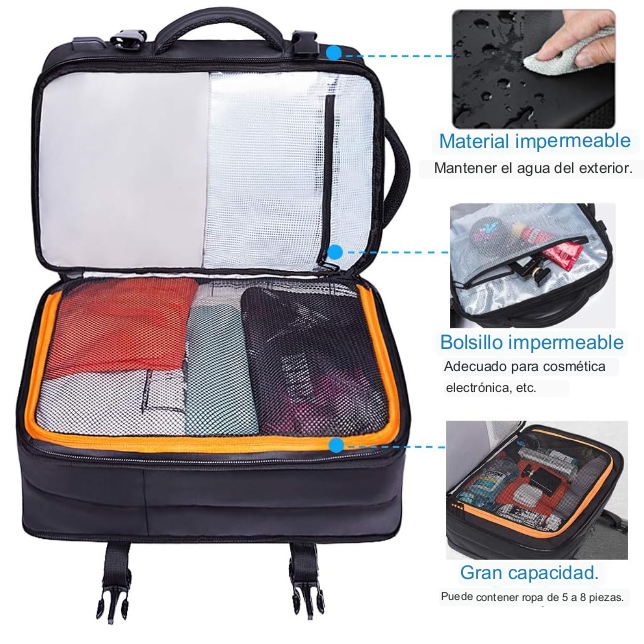 Secciones separadas para laptop, documentos, ropa y accesorios