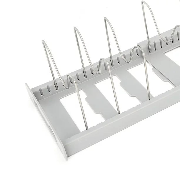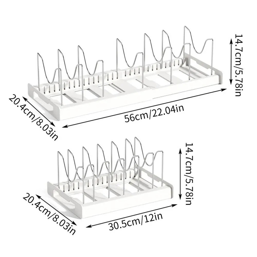 Nuestro organizador de sartenes cuenta con 7 compartimentos ajustables, permitiéndote personalizar la instalación de acuerdo al tamaño de tus ollas y sartenes.